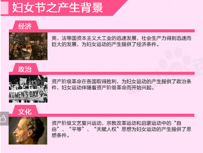 女節(jié)”、“三八節(jié)”和“三八婦女節(jié)”。是在每年的3月8日為慶祝婦女在經(jīng)濟(jì)、政治和社會等領(lǐng)域做出的重要貢獻(xiàn)和取得的巨大成就而設(shè)立的節(jié)日。