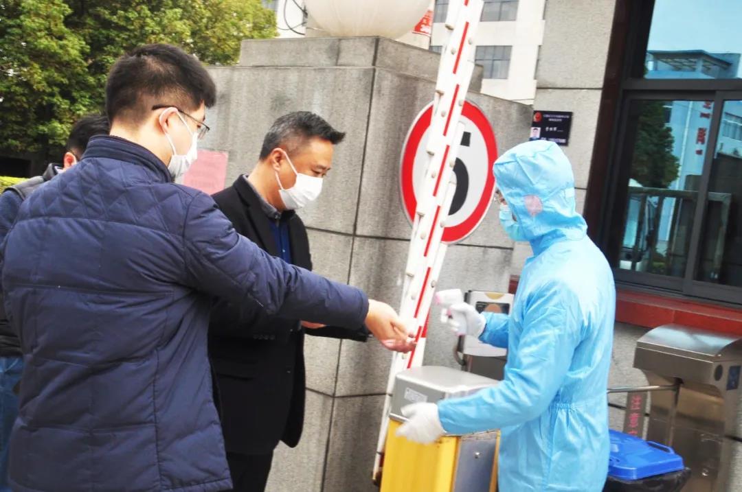 (圖為企業(yè)疫情防控小組成員在為來訪領(lǐng)導(dǎo)測量體溫)